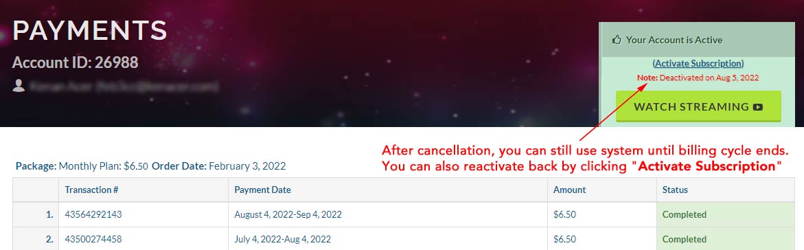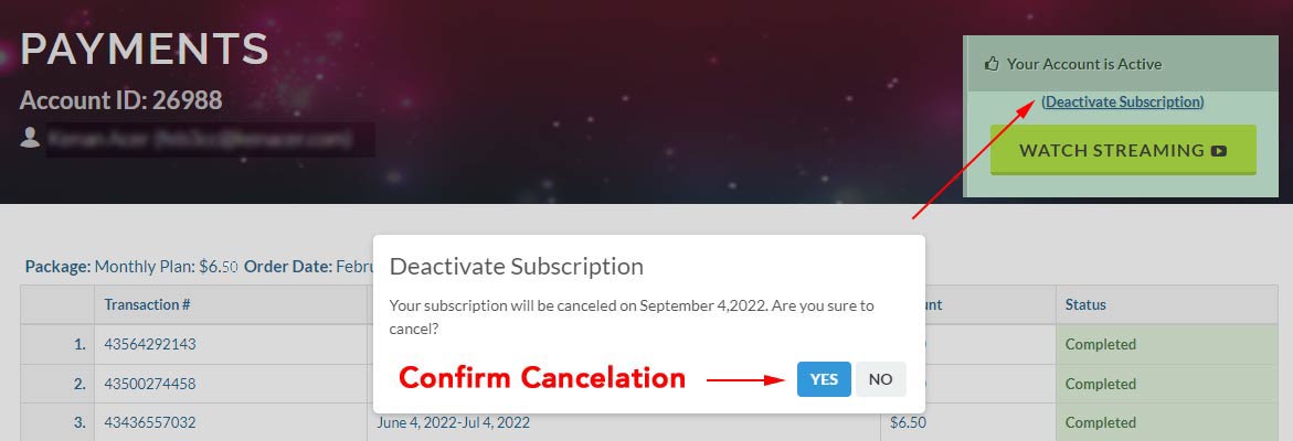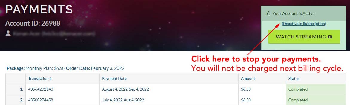 If you want to cancel an account before your next billing cycle, you can cancel your subscription directly from our web portal. Login to your account at https://boosielive.tv/myaccount.php. After login Click to "Deactivate Subcription" link. View below images for details.